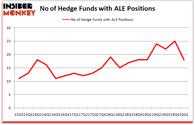 Heading into the second quarter of 2020, a total of 18 of the hedge funds tracked by Insider Monkey held long positions in this stock, a change of -28% from the previous quarter. Below, you can check out the change in hedge fund sentiment towards ALE over the last 18 quarters. So, let’s see which hedge funds were among the top holders of the stock and which hedge funds were making big moves.