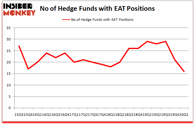 At Q1’s end, a total of 16 of the hedge funds tracked by Insider Monkey were bullish on this stock, a change of -24% from the previous quarter. On the other hand, there were a total of 29 hedge funds with a bullish position in EAT a year ago. With hedge funds’ capital changing hands, there exists a select group of noteworthy hedge fund managers who were upping their holdings meaningfully (or already accumulated large positions).