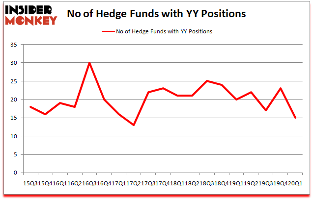 Is JOYY Inc. (NASDAQ:YY) undervalued? Hedge funds are selling. The number of long hedge fund bets decreased by 8 recently. Our calculations also showed that YY isn’t among the 30 most popular stocks among hedge funds (click for Q1 rankings and see the video for a quick look at the top 5 stocks). YY was in 15 hedge funds’ portfolios at the end of March. There were 23 hedge funds in our database with YY holdings at the end of the previous quarter.