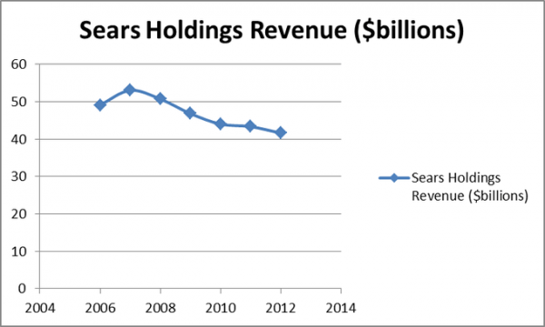 Sears Holdings Corporation (NASDAQ:SHLD) is one of the largest retailers in the U.S. with over 2,000 stores under its Sears and Kmart brands, and another 500 stores in Canada. Sears has been a stock that has disappointed me for some time now, as revenues keep falling (see below) and the company has not quite figured out a way to turn things around yet. With the company set to report year-end earnings Feb 28, is a turnaround finally on the horizon, or are more declines coming soon?