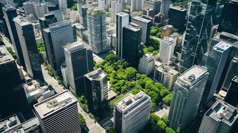 An aerial view of multiple modern high-rise commercial buildings, representing the company’s wide-ranging real estate portfolio.