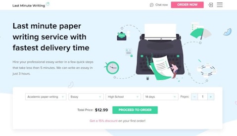 Lastminutewriting.com is a unique writing service for frenzied students requiring urgent help with last-minute tasks. The company knows that for students it is really hard to complete difficult assignment with serious deadlines, and that is why we try to provide fast and top-notch writing services. The price per page starts at $12.99, and an exclusive discount for new customers is provided – take 1st order special code “FAST15” to get 15% off.