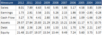 One blemish on Corning’s record, and one that has been weighing on its price, is earnings growth. Not only has average earnings growth been negative over the past five years, but it has also lagged its peers. Analysts point to narrowing margins and a heavy reliance on consumer electronics as reasons for concern. There is no arguing that Corning is cyclical, is sensitive to economic conditions, and is more volatile than average. Yet, looking past the obvious, what we have is a company with a strong record of increasing book value and generating sales, earnings, and cash flow. Figure 2 shows a snapshot of these figures for the past decade (in $ billions).
