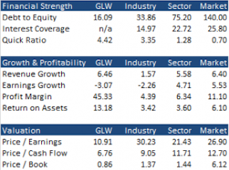 Corning Incorporated (NYSE:GLW) also looks compelling based on its financials. With low debt to equity and more than $6.1 billion in cash, its balance sheet looks solid. Looking at trailing 5 year averages, Corning Incorporated (NYSE:GLW) has outperformed industry peers and the S&P 500 across revenue growth, profitability, and return on assets. Meanwhile, Corning Incorporated (NYSE:GLW) is trading below book value (0.86x) and at a significant discount to its peers, the market, and its own historical valuation. Figure 1 shows an overview of some key financial measures.