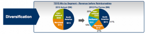 In order to finance the purchase of NetSpend, Total System will use its cash on hand and $1.3 billion in debt. The transaction is expected to be completed in the middle of 2013. In its presentation, Total System listed five main reasons to purchase NetSpend. First, Total System could enter a fast growing prepaid market that was expected to double in the next 4-5 years. Second, it could give Total System an opportunity to create new partnerships with its existing bank customers. Third, the company could expand its customer base by entering new segments, including Corporates and Government Agencies. Fourth, Total System could leverage NetSpend’s wide distribution network and innovative products. Last but not least, the deal would give Total System a better diversification. After the buyout, the North America Services segment will represent only 41% of the total revenue, while NetSpend will account for 18% of the total revenue.