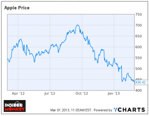 If Apple Inc. (NASDAQ:AAPL) investors thought they had already seen shares hit rock bottom at $435 shortly after last quarter’s earnings release, they were wrong. As the sequester technically begins today and the market opened lower, Apple Inc. (NASDAQ:AAPL) gapped down and was significantly lagging the market with losses of 2%, tapping a fresh 52-week low below $432 first thing in the morning.