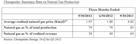 The company’s average realized price for natural gas fell to $1.97 per million cubic feet in Q3 2012 compared to $4.82 in the same period of 2011, although this was a modest improvement on Q2 2012. Natural gas production as a percent of realized revenue fell from 69% to 39% over the same period, yet natural gas as a percent of total production fell only modestly from 83% to 79%.