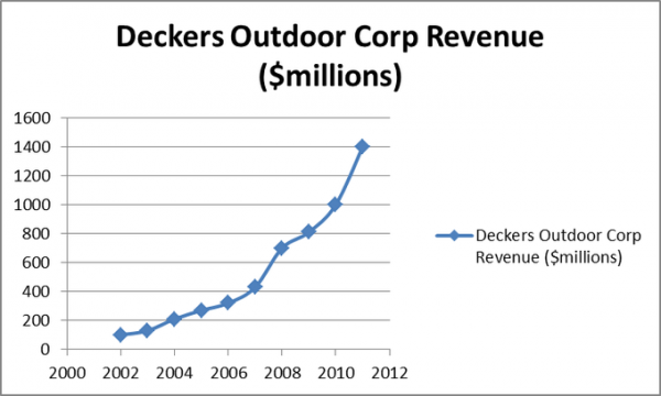 Deckers Outdoor Corp (NASDAQ:DECK) has been beaten up by Mr. Market over the past year, after an amazing run over the past decade. One of the great growth stories of the 2000’s, Deckers Outdoor Corp rose from a (split-adjusted) low of just 42 cents per share in 1998 to a peak of $118.90 in late 2011, for a phenomenal rise of 28,200% at the peak. Since the highs, it has given back some of its gains, and now trades in the low 40’s. With the company set to report 2012’s results on Feb. 19, is this growth story over or is it just beginning?