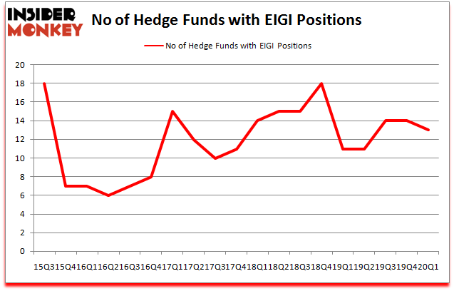 At the end of the first quarter, a total of 13 of the hedge funds tracked by Insider Monkey were bullish on this stock, a change of -7% from the previous quarter. Below, you can check out the change in hedge fund sentiment towards EIGI over the last 18 quarters. So, let’s check out which hedge funds were among the top holders of the stock and which hedge funds were making big moves.