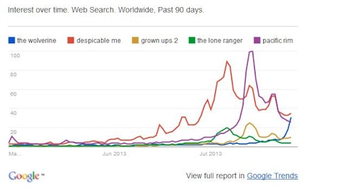 Maybe that won’t be an issue, but pure superhero movies have outperformed this summer while lesser-known comic-book adaptations have struggled. The Walt Disney Company (NYSE:DIS)‘s Iron Man 3 wowed audiences on the way to $1.2 billion in worldwide box office receipts. Time Warner Inc (NYSE:TWX)‘s Man of Steel earned $636 million at the global gate. Universal’s $130 million adaptation, R.I.P.D., got zero boost from Comic-Con, having earned just $25 million worldwide in its first week.