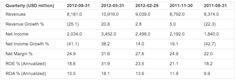 Oracle Corp.’s analysis versus peers uses the following peer-set: Microsoft Corporation (NASDAQ:MSFT), SAP AG (NYSE:SAP), EMC Corporation (NYSE:EMC), VMware, Inc. (NYSE:VMW), Intuit Inc. (NASDAQ:INTU), Adobe Systems Incorporated (NASDAQ:ADBE), Citrix Systems, Inc. (NASDAQ:CTXS), Symantec Corporation (NASDAQ:SYMC) and CA, Inc. (NASDAQ:CA). The table below shows the preliminary results along with the recent trend for revenues, net income and returns.
