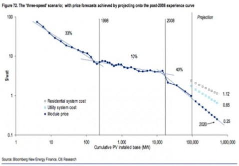 The average cost per watt of a solar panel may fall to $0.25 by 2020. The research is based on a variation of Moore’s law, which the Citigroup team calls “single speed.” The idea is that the price of solar panels will fall by 22 cents every time installed capacity doubles. The basic idea is that the cost of solar is expected to be cheaper than both natural gas and coal fire power plants by 2020. This also means that solar will become cheaper than crude oil.