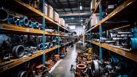 A busy warehouse stocked with a variety of industrial plumbing parts. Editorial photo for a financial news article. 8k. –ar 16:9