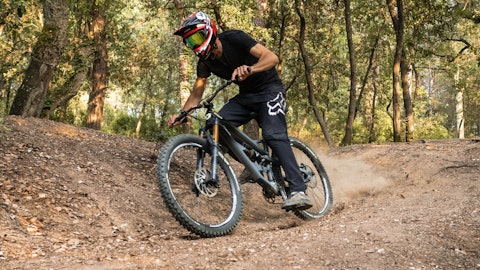 A cyclist in full gear on their mountain bike, the Performance Cycling Components visible.