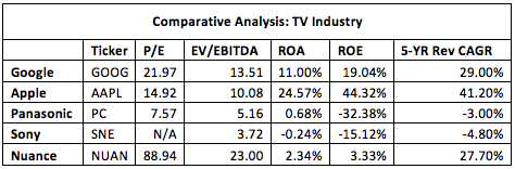 The initial AppleTV was generally viewed as a better product than the first Google Inc (NASDAQ:GOOG) TV, but tablets and phones have been the main force that has pushed Apple ahead of their comparables. Panasonic is the second cheapest company in terms of P/E and EV/EBITDA. The Japan based electronic manufacturer has the second worst ROA and five year revenue CAGR, and the worst ROE among the comparables.