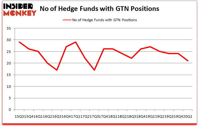At the end of the first quarter, a total of 21 of the hedge funds tracked by Insider Monkey were long this stock, a change of -13% from the fourth quarter of 2019. Below, you can check out the change in hedge fund sentiment towards GTN over the last 18 quarters. So, let’s find out which hedge funds were among the top holders of the stock and which hedge funds were making big moves.