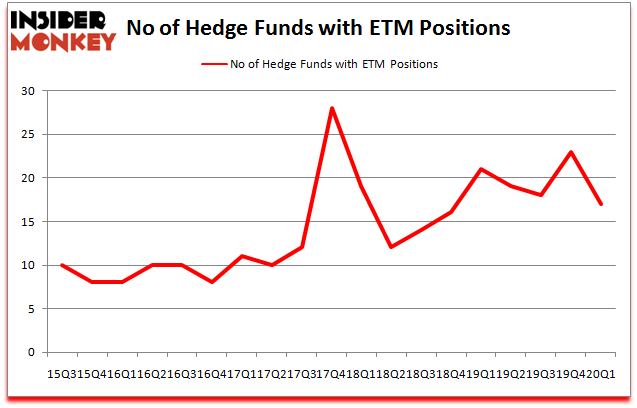 Heading into the second quarter of 2020, a total of 17 of the hedge funds tracked by Insider Monkey were long this stock, a change of -26% from the fourth quarter of 2019. By comparison, 21 hedge funds held shares or bullish call options in ETM a year ago. With hedge funds’ capital changing hands, there exists an “upper tier” of noteworthy hedge fund managers who were adding to their stakes meaningfully (or already accumulated large positions).