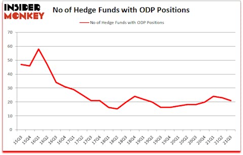 The ODP Corporation (NASDAQ:ODP) was in 21 hedge funds’ portfolios at the end of the third quarter of 2021. The all time high for this statistic is 58. ODP investors should be aware of a decrease in hedge fund interest of late. There were 23 hedge funds in our database with ODP positions at the end of the second quarter. Our calculations also showed that ODP isn’t among the 30 most popular stocks among hedge funds (click for Q2 rankings).