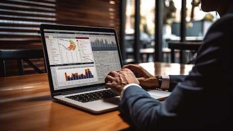A businessperson on a laptop analyzing a chart of credit card loan data.