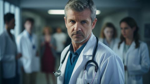A doctor in focus surrounded by colleagues in a hospital setting.