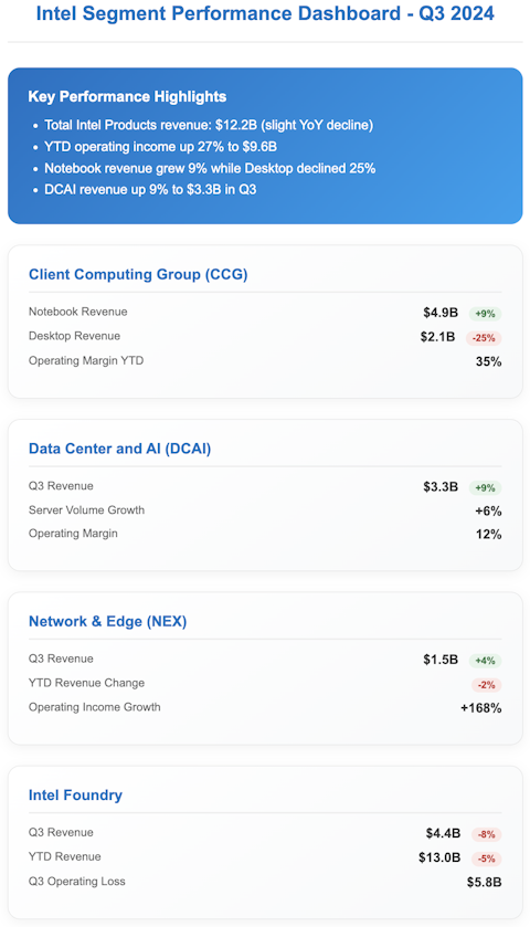 Intel’s business is structured around two main pillars: Intel Products and Intel Foundry. They also own Altera, Mobileye, and some other companies. Here’s a quick glance into how they performed in Q3: