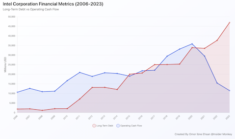 This poor performance wasn’t confined to just Q3. If you zoom out, the debt and the cash flow trends are very bearish. It will likely continue to be this way as Intel spends more on catching up.