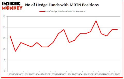 At the end of the third quarter, a total of 19 of the hedge funds tracked by Insider Monkey held long positions in this stock, a change of 0% from one quarter earlier. The graph below displays the number of hedge funds with bullish position in MRTN over the last 21 quarters. So, let’s review which hedge funds were among the top holders of the stock and which hedge funds were making big moves.
