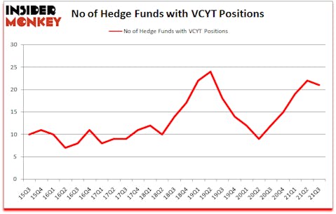 At the end of the third quarter, a total of 21 of the hedge funds tracked by Insider Monkey held long positions in this stock, a change of -5% from the previous quarter. The graph below displays the number of hedge funds with bullish position in VCYT over the last 25 quarters. So, let’s find out which hedge funds were among the top holders of the stock and which hedge funds were making big moves.
