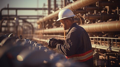A technician making adjustments to a natural gas pipeline entering a processing facility.