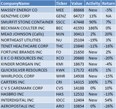 A similar story happened with Massey Energy (MEE), where Realm bought 1.3 million shares in the first quarter of 2011. Alpha Natural Resources (ANR) acquired Massey for a record premium in the first quarter of 2011. According to the terms of the merger, MEE shareholders are to receive 1.025 shares of ANR and $10 in cash for each MEE share. MEE shares were trading between a low of $39 and a high of $49 in the first quarter of 2011 where ANR shares were trading between a low of $50 and a high of $67. ANR shares were recently trading at $45.55 a share. Matthew Halbower increased his MEE ownership by 246% in the first quarter of 2011.
