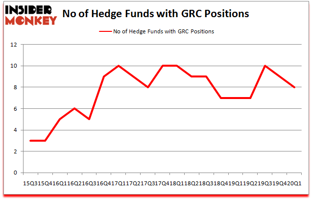 At Q1’s end, a total of 8 of the hedge funds tracked by Insider Monkey held long positions in this stock, a change of -11% from one quarter earlier. The graph below displays the number of hedge funds with bullish position in GRC over the last 18 quarters. With hedgies’ positions undergoing their usual ebb and flow, there exists a few key hedge fund managers who were boosting their stakes substantially (or already accumulated large positions).