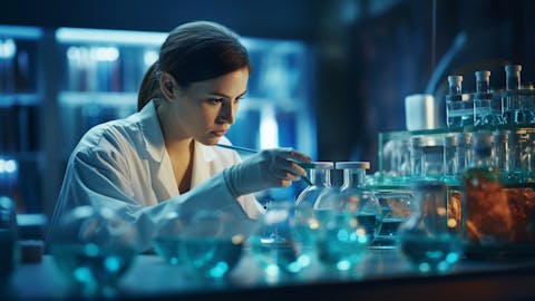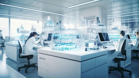 A modern pharmaceutical laboratory with research scientists working at their desks.