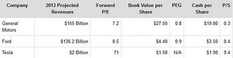 With revenue of only $2 billion projected for 2013, Tesla is a baby compared to GM and Ford. Despite this, it is trading on a much higher forward earnings multiple compared to its larger peers, a higher price-to-sales multiple and more importantly is currently trading with a 52-times price-to-book value.