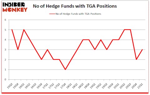 At first quarter’s end, a total of 3 of the hedge funds tracked by Insider Monkey held long positions in this stock, a change of 50% from the fourth quarter of 2020. Below, you can check out the change in hedge fund sentiment towards TGA over the last 23 quarters. So, let’s see which hedge funds were among the top holders of the stock and which hedge funds were making big moves.