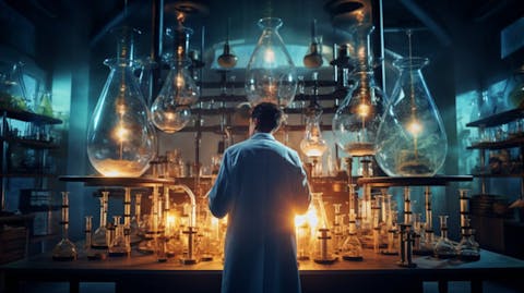 A laboratory full of vials, tubes and Bunsen burners, with a scientist in the center examining a chemical.