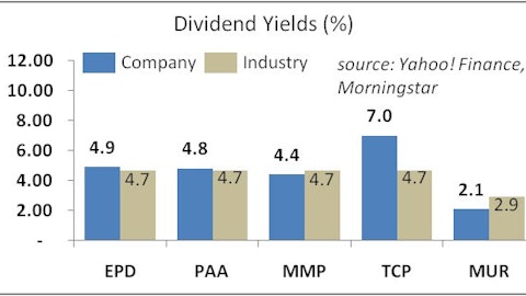 Marathon’s peers include Phillips 66 (NYSE:PSX) and Valero Energy Corporation (NYSE:VLO), Imperial Oil Limited (NYSE:IMO), and Murphy Oil Corporation (MYSE:MUR). These stocks are also generally on the cheaper side: Phillips and Valero, which have a more pure exposure to refining and marketing operations, have forward earnings multiples in the 6-8 range, placing Marathon actually in the middle of these close peers and suggesting that the entire industry may be overvalued in the market. The forward P/Es for Imperial and Murphy are only slightly higher, so those companies look cheap as well.