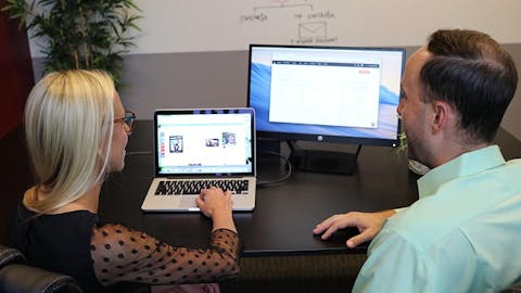 A close-up of a laptop displaying the company’s interactive podcasting platform.
