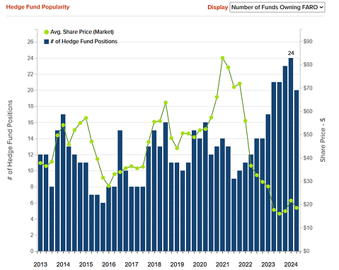 As you can see from the graph above FARO’s stock price came down from $80+ to $18 over the last 3 years. However, as the stock price declined more and more hedge funds found the stock attractive and the number of hedge funds with bullish FARO positions more than doubled over the last 3 years. There have also been multiple insider purchases in the stock in low teens and more recently at around $17 over the past year and half (see details here). Insider purchases coincided with the bottom in FARO shares.