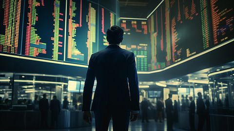 A business executive in a suit walking through a busy trading floor of a stock exchange.