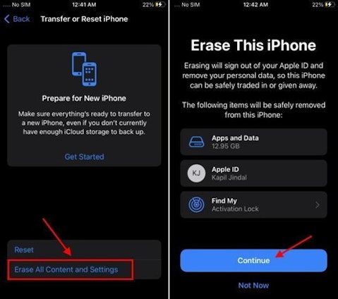 Step 1. Before you start, ensure that the smartphones are connected to the same network. Access the “Settings” on your iPhone and look for the “General” section, where you’ll find the “Transfer or Reset iPhone” option on the screen. Use the “Erase All Content and Setting” option and tap the “Continue” button to reset your device. Do not forget to upload all your data to iCloud before executing the process.