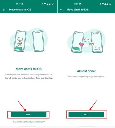 Step 4. Launch WhatsApp on your iPhone, which will display a “Move Chats from Android” window. After providing the necessary permissions, tap the “Start” button to start the transfer. Once the process is concluded, set up your profile and successfully transfer WhatsApp to your iPhone.