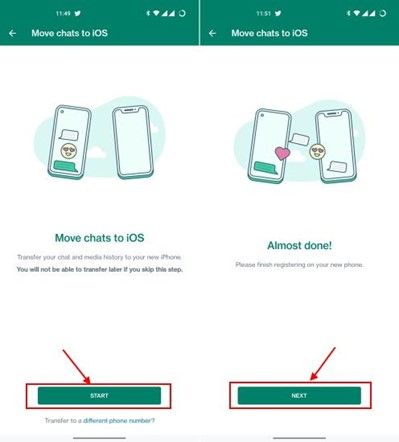 Step 4. Launch WhatsApp on your iPhone, which will display a “Move Chats from Android” window. After providing the necessary permissions, tap the “Start” button to start the transfer. Once the process is concluded, set up your profile and successfully transfer WhatsApp to your iPhone.