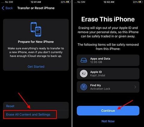 Step 1. Before you start, ensure that the smartphones are connected to the same network. Access the “Settings” on your iPhone and look for the “General” section, where you’ll find the “Transfer or Reset iPhone” option on the screen. Use the “Erase All Content and Setting” option and tap the “Continue” button to reset your device. Do not forget to upload all your data to iCloud before executing the process.