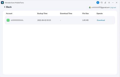 Step 1. After you have launched the MobileTrans on your computer, log in to your Google Drive after opting for the “Google Drive to WhatsApp” option across the “WhatsApp Transfer” module. Look for the backup you want to transfer and click “Download.”