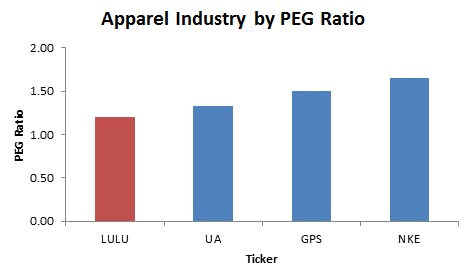 Lululemon’s trailing P/E ratio is also a bit misleading. Yes, the stock looks expensive at 42 times trailing profits, well above The Gap, Nike, and Under Armour. But Lululemon’s valuation is much more reasonable once we take into account the company’s growth potential, and value the stock on a PEG basis.