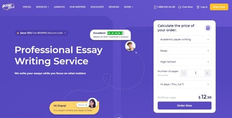 Boomeassays.com is one of the best essay writing services which offers knowledge in some complex and technical topics. Usually, their main clients are students in higher education such as high school and college. They offer different types of papers that solicit varied academic levels including essays, research papers, lab reports and many other types of writing. Most of the work is done by a group of highly educated writers who specialize in various several fields which provides a high quality of expertise for the student. It is also very affordable, up to the standard. They have good prices that starts as low as $12.99 per page along with a 15% discount for any first order with them.