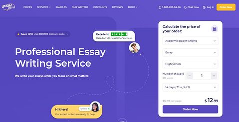 Boomeassays.com is one of the best essay writing services which offers knowledge in some complex and technical topics. Usually, their main clients are students in higher education such as high school and college. They offer different types of papers that solicit varied academic levels including essays, research papers, lab reports and many other types of writing. Most of the work is done by a group of highly educated writers who specialize in various several fields which provides a high quality of expertise for the student. It is also very affordable, up to the standard. They have good prices that starts as low as $12.99 per page along with a 15% discount for any first order with them.