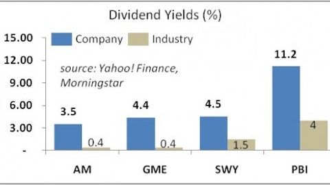 Bank of Nova Scotia (NYSE:BNS) is the third largest bank in Canada. The company pays the smallest dividend yield our five stocks at 4.3% and payout ratio of 44%. The general banking sector remains strained, but Bank of Nova Scotia expects commercial banking to carry the company in the interim, with the segment making up 22% of net income for the past year. As well, net interest income is expected to be up 11% this year from 2011.
