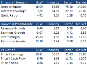 Corning Incorporated (NYSE:GLW) also looks compelling based on its financials.  With low debt to equity and more than $6.1 billion in cash, its balance sheet looks solid.  Looking at trailing 5 year averages, Corning Incorporated (NYSE:GLW) has outperformed industry peers and the S&P 500 across revenue growth, profitability, and return on assets.  Meanwhile, Corning Incorporated (NYSE:GLW) is trading below book value (0.86x) and at a significant discount to its peers, the market, and its own historical valuation.  Figure 1 shows an overview of some key financial measures.