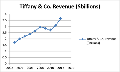 As mentioned, Tiffany & Co. (NYSE:TIF) is a truly international company and is getting bigger.  In 2012, 50% of the company’s revenue came from North America, with 21% from Asia (excluding Japan), 17% from Japan, and 12% from Europe, where I see the most potential for expansion once Europe’s economic troubles are behind them.